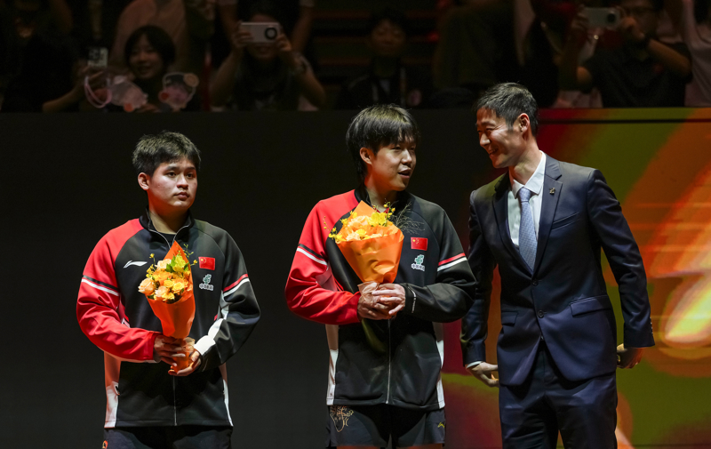 10月4日晚,由世界头二号男单组成的男双组合毫无悬念地登顶WTT中国大满贯,王楚钦/林诗栋以3比0战胜队友周启豪/陈俊菘,为国乒拿下继混双、女双之后的本站第三个冠军。中国乒协主席王励勤亲自为他俩颁奖。