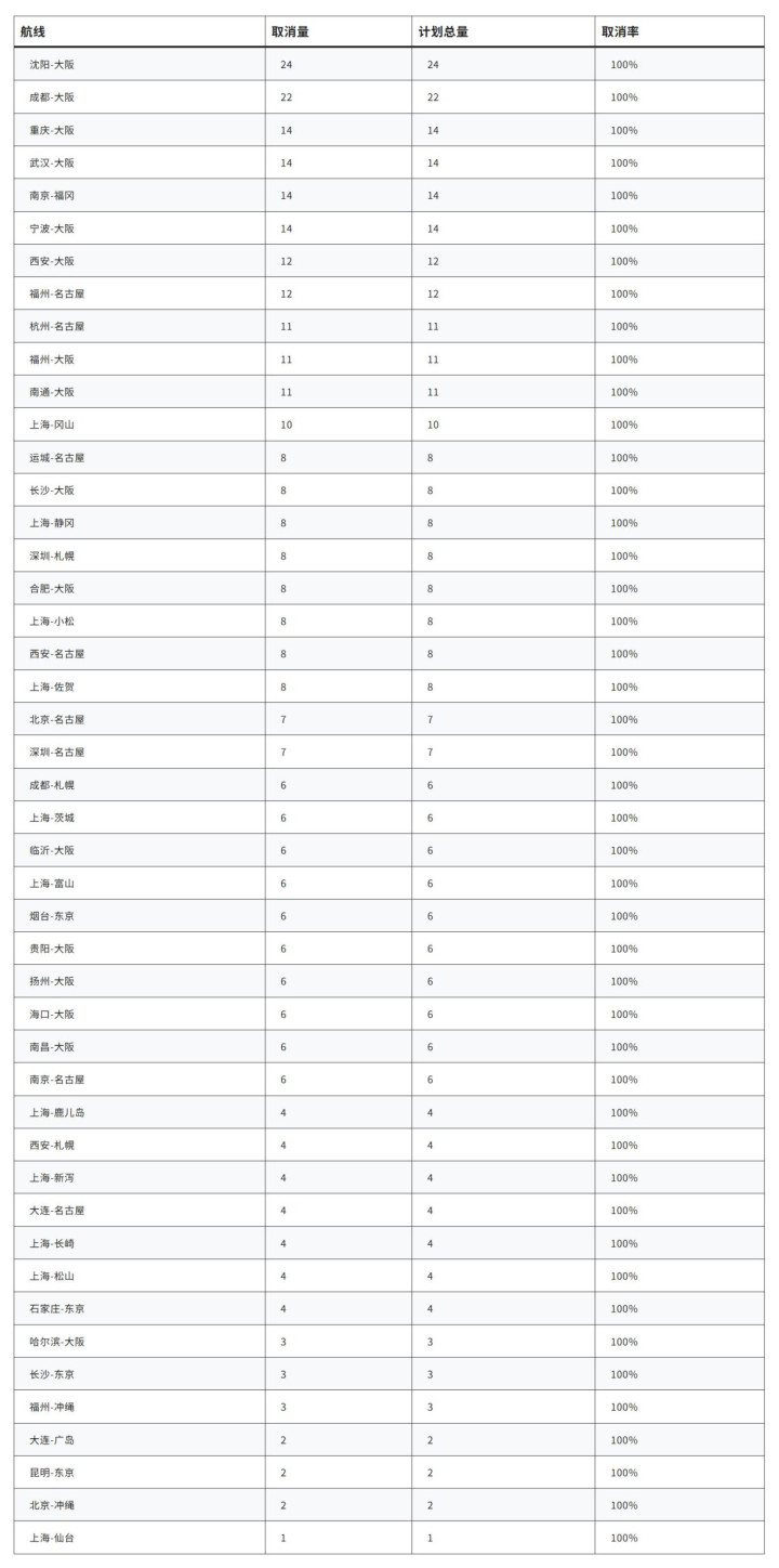 其中,上海浦东、虹桥两场共有14条航线全部取消,为取消最密集的城市;大阪关西机场成为中方航点直飞最多的日方目的地,超过10条航线停飞。